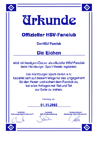 Im November 2002 hatten wir dann unseren großen Tag., die Ernennung und Urkundenübergabe beim HSV. Wir waren mächtig stolz, denn wir hatten die Mitgliederzahl schon auf über 100 erhöht.